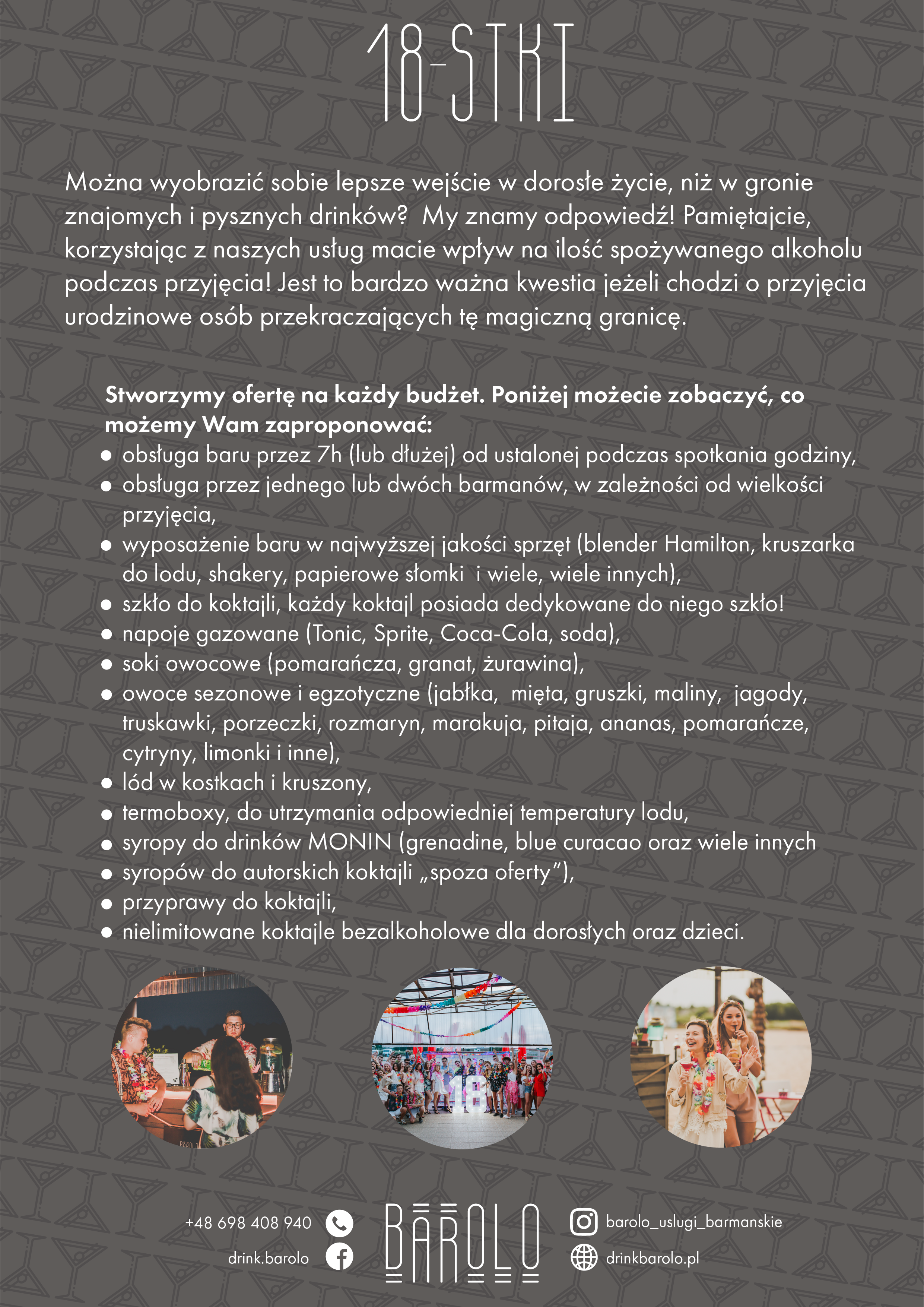 Planujesz swoje przyjęcie urodzinowe? 18 urodziny to nie lada okazja do świętowania. Chcesz urozmaicić swoje przyjęcie oraz w odpowiedni sposób ugościć przyjaciół? Świetnie trafiłeś! Dzięki naszemu drink barowi Twoi Goście, którzy tak jak Ty niedawno przekroczyli tę magiczną granice, będą mogli posmakować tego, co jeszcze niedawno było zakazane 🙂