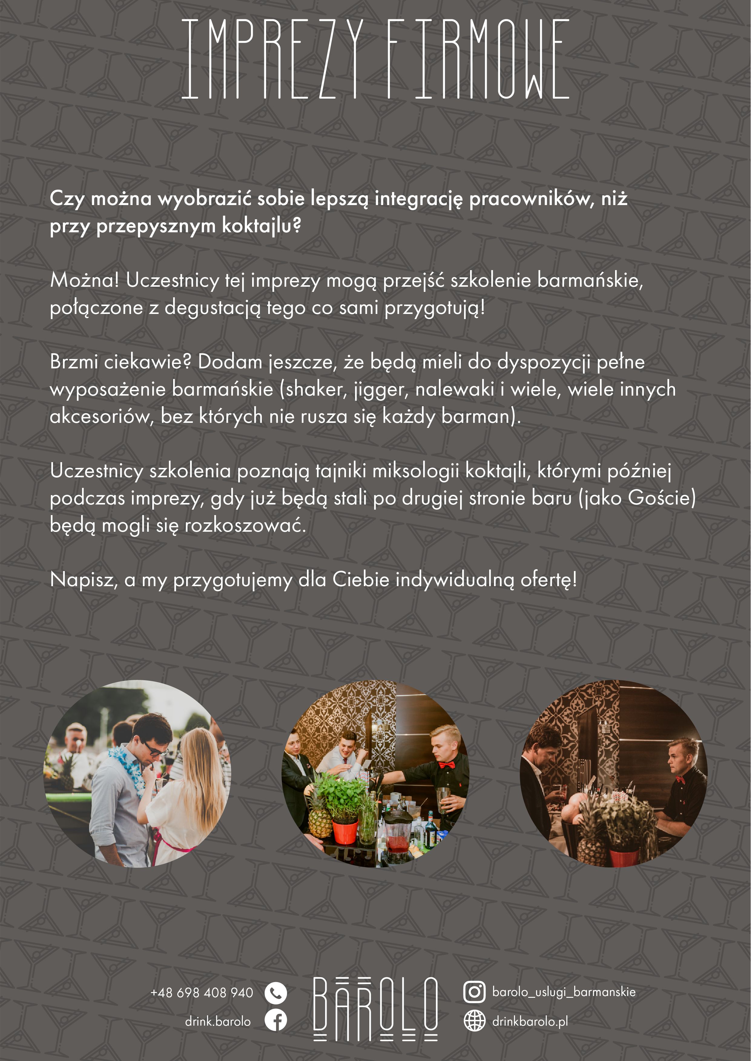 Tego typu impreza to doskonała okazja do integracji pracowników Twojej firmy! A jeżeli mowa o integracji, to chyba nie można wyobrazić sobie lepszej atmosfery do rozmowy, jak przy pysznym drinku. W naszej ofercie mamy także możliwość przeprowadzenia dla Państwa warsztatów barmańskich, podczas których każdy uczestnik otrzyma pełny zestaw niezbędny do przygotowania koktajli.