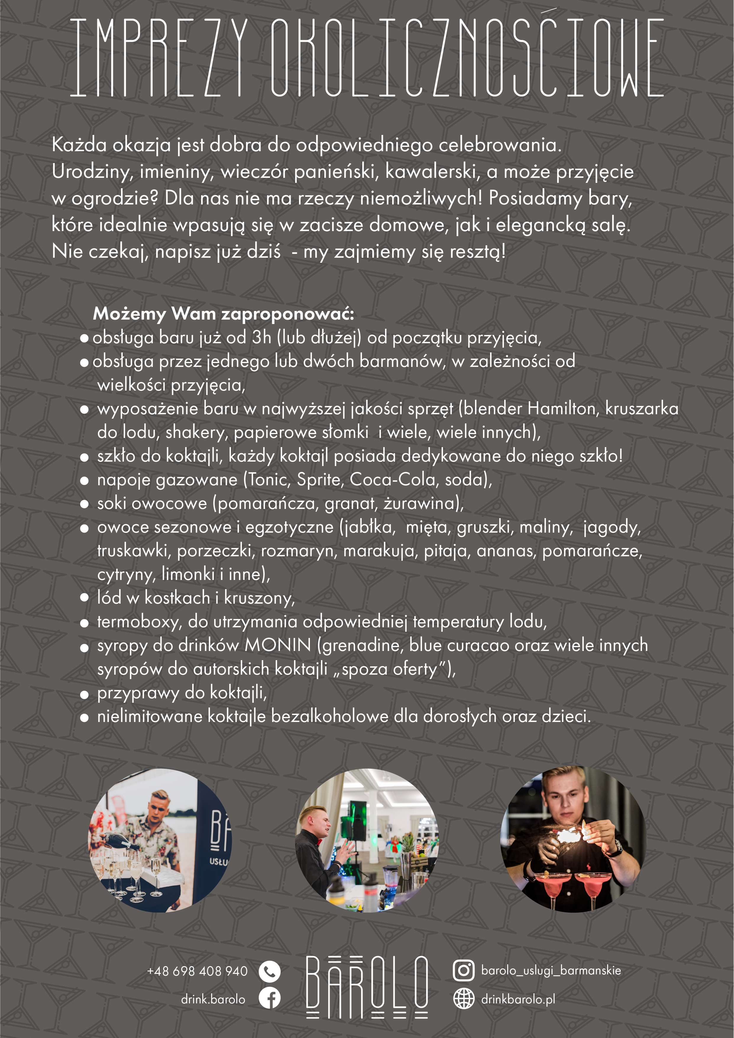 40-stka, 50-tka? a może rocznica ślubu? Każda okazja jest dobra do odpowiedniego świętowania! Nasz drink bar odnajdzie się podczas każdego przyjęcia. Indywidualne oferty sprawdzą się na każdą kieszeń, a my dołożymy wszelkich starań żeby ten wieczór pozostał w pamięci Waszych Gości na dłuuuuugo!